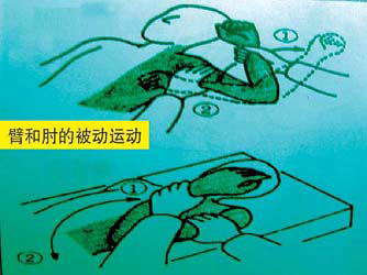 积极帮助患者保持正确姿势(坐姿及睡姿),妥当帮助病人改变姿势和被动运动(见图)。