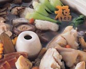 4. 除油菜、胡萝卜外,所有材料放入砂锅中,加入热水盖过料面,移入蒸锅蒸40~60分钟至完全熟透,取出,加入B料调味,再放入油菜及胡萝卜即可。