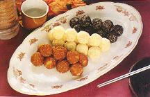 6、等糕饼凉了控干,放到糖液里。然后从糖液里捞出来其中的1/3蘸捣碎的洋蘑菇、另外1/3蘸捣碎的大枣、剩余的蘸松树花粉放到盘子里。