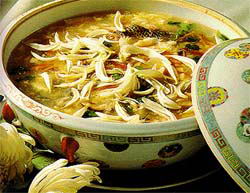3、将炒锅加油置旺火上,投入葱段煸出香味,舀入鸡汤煮沸,加入料酒、笋丝、冬菇丝、再煮沸后,将鱼肉同蛋黄、豆腐原汁落锅,加酱油、精盐、醋搅匀,起锅装盘,撒上菊花、熟火腿丝、姜丝和胡椒粉即可.