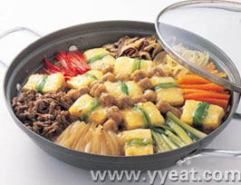 (7)把豆腐放在荤杂烩框里﹐在豆腐之间配各色蔬菜﹐肉放好﹐并将酱汤调味倒进去﹐鸡蛋也打进去熟鱼。休 闲 居 编 辑