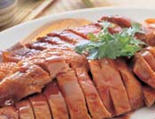 4. 将鸭肉剁块、排入盘中,面上淋上汤汁,并撒上香菜末即成。