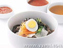 (4)把面条放在面条碗中﹐再上面放胡萝卜﹑黄瓜﹑紫菜﹐并放佐料酱拌着吃。