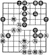 目前红车有先手吃7路卒的着法,对黑方很不利,如何化解红方的反击? 黑方终于寻出退炮牵住红 马的方法,使红车不能离开此地,黑方由此展开攻势,终于形成了胜局。黑方先行: