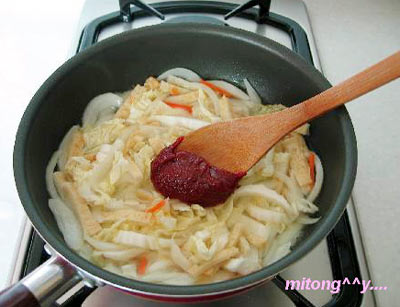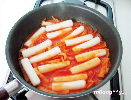 煮至水滚加上适量的韩式辣椒醬,我的韩式辣椒醬是帶甜味的。所以不需再加糖,如果用的是原味的韩式辣椒醬就要加糖唷:) 因為辣炒年糕吃起來要甜甜辣辣的才好吃!