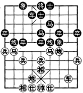 隔河相望。现轮黑方走子,通过巧弃中卒,进车捉马,伸炮打车等一系列争先手段,取得先手。实战着法如下: