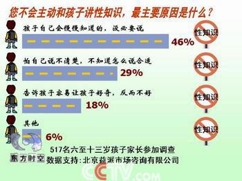 就这么一个问题,结果一百个人里面才能找到一个被访者。而且大家注意了没有,刚才这些受访的家长纷纷说因为自己孩子小,觉得没有要跟他说这个问题,但问题是我们调查的对象都是6到13岁年龄段的父母,6到13岁这个年龄段,专家们说,正是进行早期性教育最佳年龄段,这样的一个年龄段还小吗?