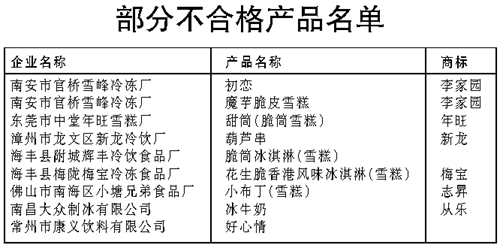 国家质检总局是对13个省、直辖市、自治区71家企业生产的雪糕进行抽检后,得出这一结论的。抽查结果还显示,大型企业抽样合格率较好,其中一些知名品牌的产品合格率为100%,如和路雪、雀巢、伊利、蒙牛、八喜等市场占有率大的知名品牌。
