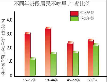 我国居民不吃早餐的比例比较高,达到3.2%,尤其是城市青年人,不吃早餐的比例最高,达4.6%。