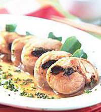 5.将作法3中的鸡腿肉摊平,放上作法1的梅肉,再像寿司作法一样卷好,并以棕绳捆绑缠紧后备用,再放入锅内蒸10分钟。