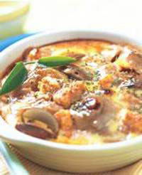 7.取刚盆,放入作法1、2、3、6的材料混合搅拌均匀后,倒入烘烤器皿内,再将作法5的材料平铺在上后,放入炉温250℃的烤箱中,烤至表面呈现焦黄色即可取出,再撒上少许的绿茶末即可。