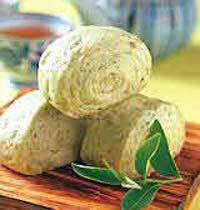5.将作法4中卷好的五榖饭先贴上新鲜茶叶片装饰后,再以保鲜膜包裹密封,并放进锅中蒸约5分钟即可。