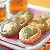 7.将作法3中的心型绿茶面皮,放入作法6的原味面皮中,再以圆形模型压模。