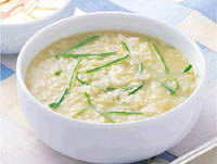 原料:猪瘦肉50克,松花蛋1个,粳米50克,精盐、味精、鲜汤各适量。
