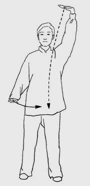 动作一:接上式,两腿徐缓挺膝伸直;同时,左掌上托,左臂外旋上穿经面前,随之臂内旋上举至头左上方,肘关节微屈,力达掌根,掌心向上。掌指向右;同时,右掌微上托,随之臂内旋下按至右髋旁,肘关节微屈,力达掌根,掌心向下,掌指向前,动作略停;目视前方。