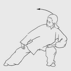 动作四:上动不停。身体重心左移;同时,上体由右向前、向左旋转;目视右脚。