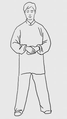 做完三遍后,身体重心右移,左脚回收成并步站立;同时,两拳变掌,自然垂于体侧;目视前方。