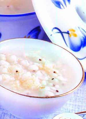 用料:生山药60g,生薏苡仁60g,柿饼30g。制法:先将薏苡仁加水煮至烂熟,再将山药捣碎,柿饼切丁,继续煮片刻即成糊粥。服时可酌加白糖,早晚食之为宜。效用:补肺健脾,甘润益阴。凡阴虚内热,午后低热,劳嗽干咳,饮食懒进,大便泄泻者,皆可辅食此粥。