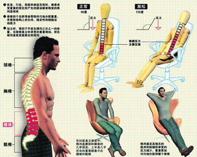 据《泰晤士报》28日报道,研究者称,长期坐在办公室的上班族理想的坐姿是上半身与大腿成约135度。这样可能给使用电脑带来不方便,但脊椎承受的压力比弓着背和直坐小。