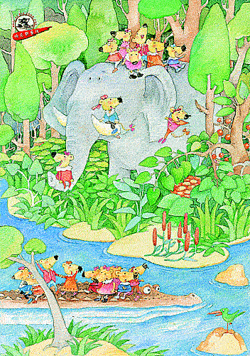 瞧!大象成了他们的旅行车,带着九只小老鼠,免费游览神秘的森林王国。
