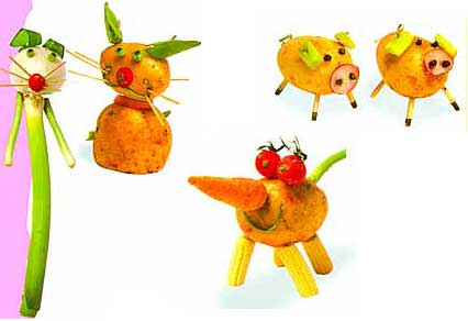 我们可以用水果和蔬菜做成各种各样的东西。可以将一个土豆变成一张滑稽的小脸,或者做成一个苹果脸的女人。只要记住一点:我们是使用水果和蔬菜,可不是让你吃掉啊!