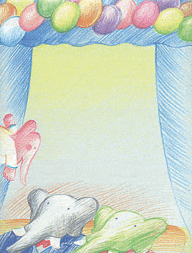 新年歌合唱结束了,糖果发完了,象爸爸和象妈妈拼命地鼓掌。礼物车里撒糖果的小象蹦出了车厢,向观众致意,哦,他也不是拉拉。