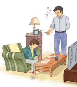 (父亲一边手拿小木棍敲打着柜子,一边喝斥儿子。儿子在一边低头不语。)