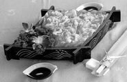 素食有外形模拟和味道模拟的不同,这道龙虾刺身看起来洁白的“虾肉”中有丝丝缕缕的红色肌理,放在冰块之上,蘸着青芥辣吃,口感冰、爽、脆、冲。闭上眼睛以为吃的就是龙虾,可谓形神兼备,模拟到家。