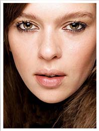 流行要点:最近几年来横扫千军的古铜质感粉底妆容终于有了淡出的趋势,正在逐步转化为对晶莹白嫩的自然肤色的追求,粉底也喜欢薄薄的带有闪光的质地。随之而来眼部和唇部的点缀趋势也要求更多的闪亮或晶莹质地。