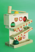 三个不同色彩的圆木球,顺着轨道下行,最后从哪里滚出来呢?让宝宝观察观察吧。