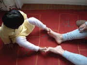 爸爸用大脚丫去夹宝宝的小脚丫,夹住了还可以轻轻拧一拧,宝宝会觉得又痒又好玩。他会笑,会很自然把小脚丫藏起来,然后他又会忍不住好奇地伸出小脚丫逗逗大脚丫。稍微大一些的宝宝,还会练习用自己的小脚丫去夹爸爸的大脚丫。