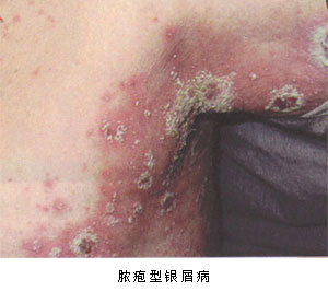 泛发性脓胞型银屑病,以四肢屈側及皱襞处较多,也可累及全身,皮损初发为在急性炎症红斑的基础上,出现多数密集针头至粟粒大小无菌性表浅脓胞,附有少量菲薄鳞屑。脓胞迅速增多,相互融合成大片脓糊状或成为环形红斑状,但其下又可再发新的脓胞,常因接触摩擦等外因,使脓胞破裂形成糜烂结痂。