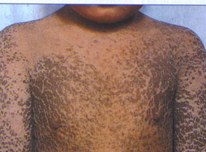 板层状鱼鳞病系常染色体隐性遗传,生后全身即为一层广泛的人棉胶状的膜紧紧地包裹,多引起眼睑及唇外翻。数日后该膜脱落,皮肤呈广泛弥慢性潮红,上有灰白色或灰褐色多角形或菱形大片鳞屑,中央固着,边缘游离。往往对称性发于全身,以肢体屈侧、肘窝、国窝、腋窝和外阴等部较为明显。掌跖过度角化,指甲及毛发过度生长.病程经过迟缓,可终生存在,至成年期红皮症可减轻,但鳞屑仍存在。本病属常染色体隐性遗传。 休闲 居编 辑