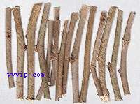 【生药材鉴定】:干燥的嫩枝呈长圆柱形,长短不一,直径0.5~l厘米。外表灰黄色或灰褐色,有多数谈褐色小点状皮孔及细纵纹,并可见灰白色半月形的叶痕和棕黄色的叶芽。质坚韧,有弹性,较难折断,断面黄白色,纤维性。斜片呈椭圆形,长约2毫米。切面皮部较薄,木部黄白色,射纹细密,中心有细小而绵软的髓。有青草气,味淡略粘。以质嫩、断面黄白色者为佳。显微鉴定:粉末:灰黄色。①纤维多缠结,淡黄色或无色,甚长,略弯曲,直径8