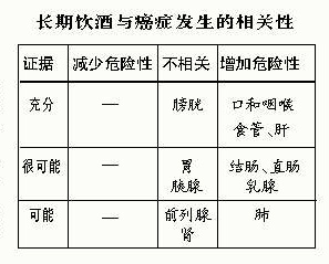 国际癌症研究基金会和美国癌症研究中心关于《膳食、营养与癌症预防》中指出,长期饮酒与不同部位癌症发生的危险性和不相关性可归纳如下: