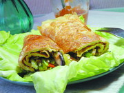 3.鸡蛋打散成汁,用平底锅煎成饼状。分割成适当大小后分别加入炒好的蔬菜,卷成长形,盛盘即可。