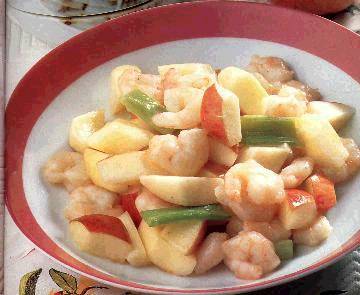 5、在锅中放入高汤,并加入1小碗水略煮一下,放入少许鸡精调味,最后放入虾仁收汁起锅,装入事先烤好的金盏里。