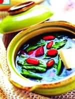 4、食前五分钟,在汤料中放入菠菜,煮至微沸,下盐,调好口味,即可盛入汤盘。盛盘时,先盛上牛肉片,放上剖开的熟鸡蛋,再舀上菠菜和汤,最后浇上奶油即成。本汤咸酸爽口,色泽艳丽。