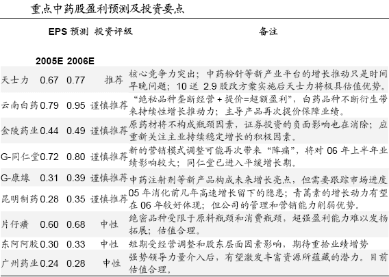 ●“品牌中药”股仍是良好的价值防御型配置品种“品牌、技术、资源”型中药上市公司具持续增长潜力,表现为业绩稳定,分红优厚。我们认为,在全流通背景下,行业地位突出,发展前景明朗的品牌中药股,动态PE在18~22倍是合理的。个股推荐力度依次为:天士力、云南白药、金陵药业、同仁堂。