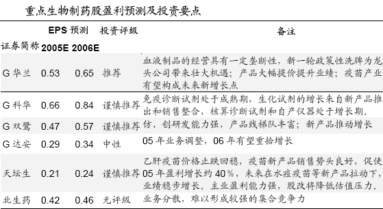 ●分享龙头型生物制药股的成长生物制药子行业龙头企业正处于快速成长期。表现为盈利能力强,募集资金项目将集中于06~07显现效益,未来有望借助“技术、管理优势+子行业领先优势”进一步巩固竞争地位,充分分享子行业成长。对处于成长期的龙头生物制药股,动态PE在20~23倍是合理的。个股推荐力度依次为:华兰生物、科华生物、双鹭药业、天坛生物。