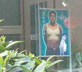 昨日下午,记者在深圳市罗湖区一闹市区的路边看到了这则非常惹眼的广告。广告安装在路边一专卖店外的橱窗上,大小约1平方米左右。广告中一名戴着眼镜的中年男子上身穿着一件女性的文胸,旁边还有说明:“‘峰’”胸,就这么简单……”由于广告紧靠在路边,而且来往的行人也比较多,一些行人不禁被吸引而不自觉地看几眼。