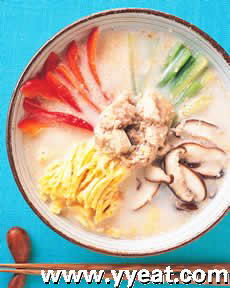 (1)鸡肉先洗净,与6杯水及2小匙盐一起煮开,煮开后,转小火再煮20分钟。将肉取出切成小丁,并撒上少许胡椒粉略腌一下。等汤汁冷却后,去除油脂备用。