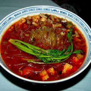 “酸辣粉”是四川城乡间广为流传的传统小吃之一,由于价廉物美,长期以来一直受人喜爱。“酸辣粉”主要采用红薯粉加工而成。“酸辣粉”分为两种:一种为“水粉”,即用红薯淀粉自己调配制作的;另一种为“干粉”,即加工成粉条状的干粉条。由于干粉条制作的酸辣粉较为简易方便,全国各地大都采用干粉的制作方式,而“水粉”的调制操作就相对复杂一些。下面介绍“水粉”的制作过程。