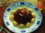 2、 用刀刮净火腿皮上的细毛和污渍,洗净。将火腿肉面朝是放在砧板上,切成12个小方块,放在碗里,用清水浸没,加入绍酒25克、冰糖25克,上蒸笼用旺火蒸1小时,至火腿八成熟时,滗去汤水,再加入绍酒25克,冰糖75克,用清水浸没,放在蒸熟的莲子。再上蒸笼用旺火蒸1小时30分钟,将原汁滗入碗中,待用。将火方扣在高脚汤盘里,围上莲子,缀上樱桃、青梅。