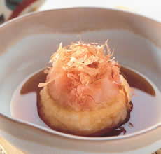 4.起油鍋,用中溫油將豆腐炸至金黃色,盛入器皿中,放上紅葉蘿蔔泥,淋上作法3的醬汁,上面再撒上柴魚片即可。