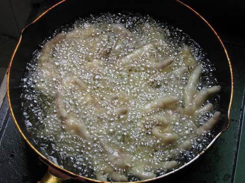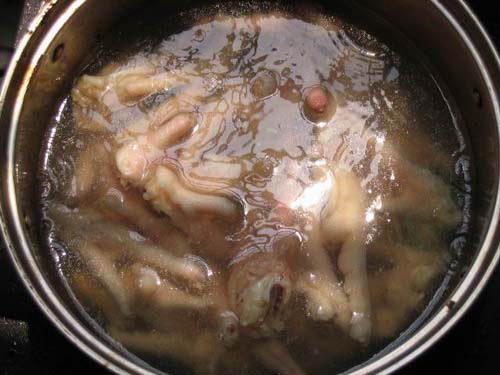 把鸡爪修理干净后放入水里煮(放一勺麦芽糖、一勺白醋,可防止煮到皮烂)休闲居 编 辑