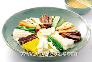 黄瓜(小)0.5个(50g)﹐梨0.25个﹐胡萝卜50个﹐洋白菜50g﹐煮的竹笋50g﹐栗子3个﹐松子1小勺﹐鸡蛋1个﹐鳆鱼1只﹐牛排骨肉片50g﹐胡椒面﹑盐适量