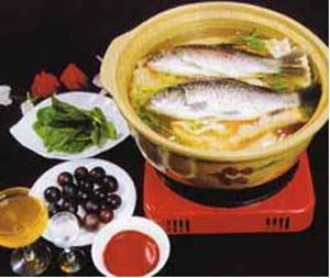 (4)炒锅置上火,下油加热,放姜蒜片,葱,泡红椒,炒香。掺白汤,放河鲫鱼,味精,鸡精,料酒,胡椒粉,烧沸,去尽浮沫,倒入锅内,上台即可。