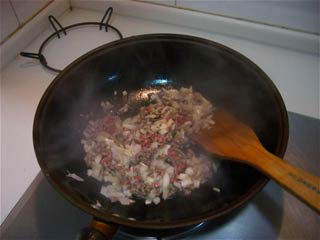 加入碎洋葱,香菜沫,牛肉沫,炒呀炒