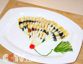 3、将蒸好的三色蛋倒在熟菜板上放凉,改刀切片后即可食用。